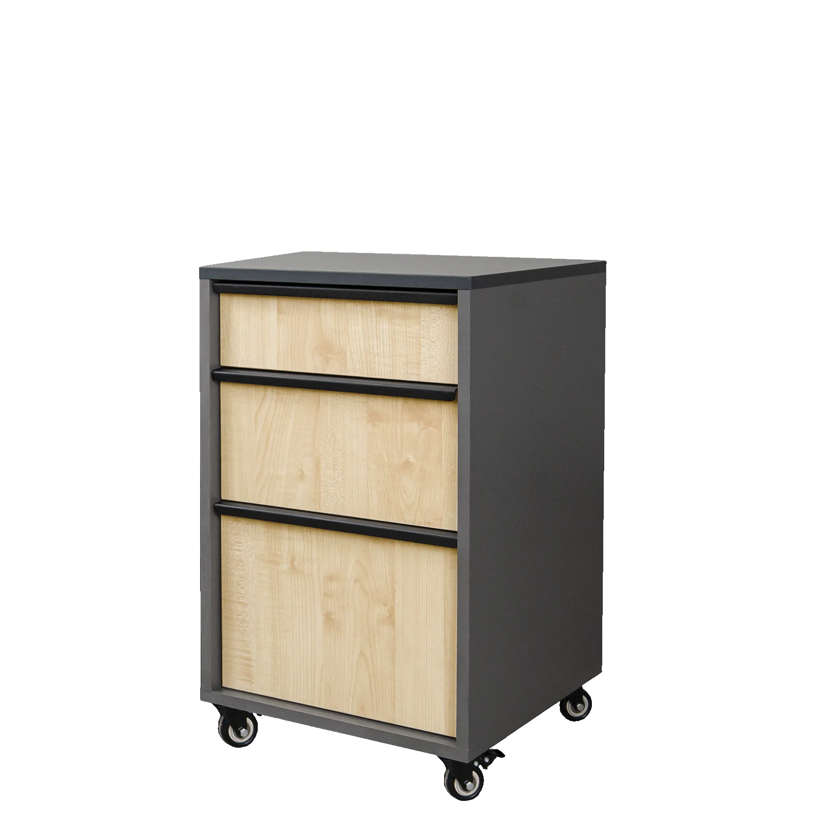 - Выдвижные ящики разные по глубине, для разнообразных вариантов их заполнения: верхний – узкий, для канцелярии, в него можно вложить органайзер для удобного хранения мелких предметов; средний ящик для хранения бумаг, папок; нижний ящик , самый глубокий и вместительный, удобен для хранения более высоких предметов. Каркас ящиков в цвете Серый камень, фасады - Клен Танзай/Серый камень