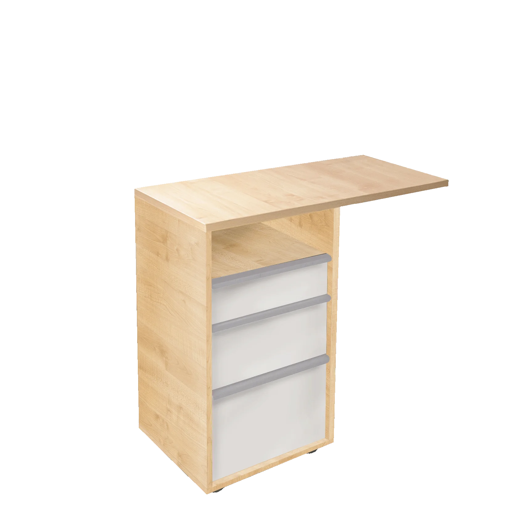 Приставная тумба высотой в уровень высоты стола. Благодаря удлиненной крышке тумбы и ее асимметричной форме, в сочетании со столом создается большая эргономичная рабочая поверхность, где можно разместить все необходимое для работы, в т.ч поставить принтер и другую орг. технику. Вкладные ящики с минималистичными ручками-профиль. Небольшое углубление ящиков внутрь тумбы скрывает выступы ручек и создает аккуратный стиль. При заказе необходимо сразу выбрать левостороннюю или правостороннюю тумбу.