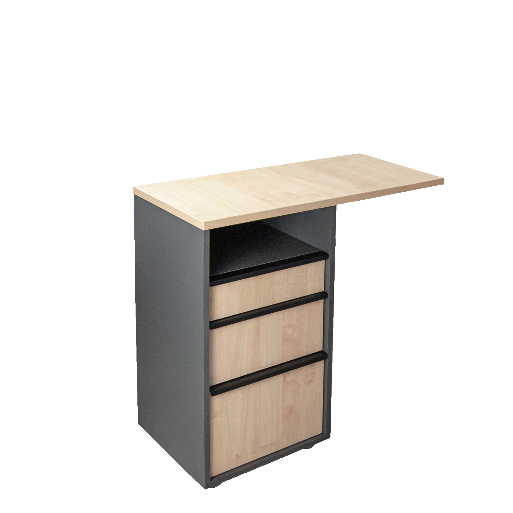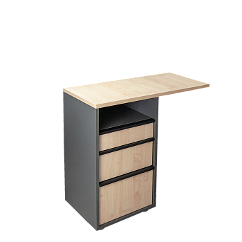 - Выдвижные ящики разные по глубине, для разнообразных вариантов их заполнения: верхний – узкий, для канцелярии, в него можно вложить органайзер для удобного хранения мелких предметов; средний ящик для хранения бумаг, папок; нижний ящик , самый глубокий и вместительный, удобен для хранения более высоких предметов. Каркас ящиков в цвете Серый камень, фасады - Клен Танзай/Серый камень