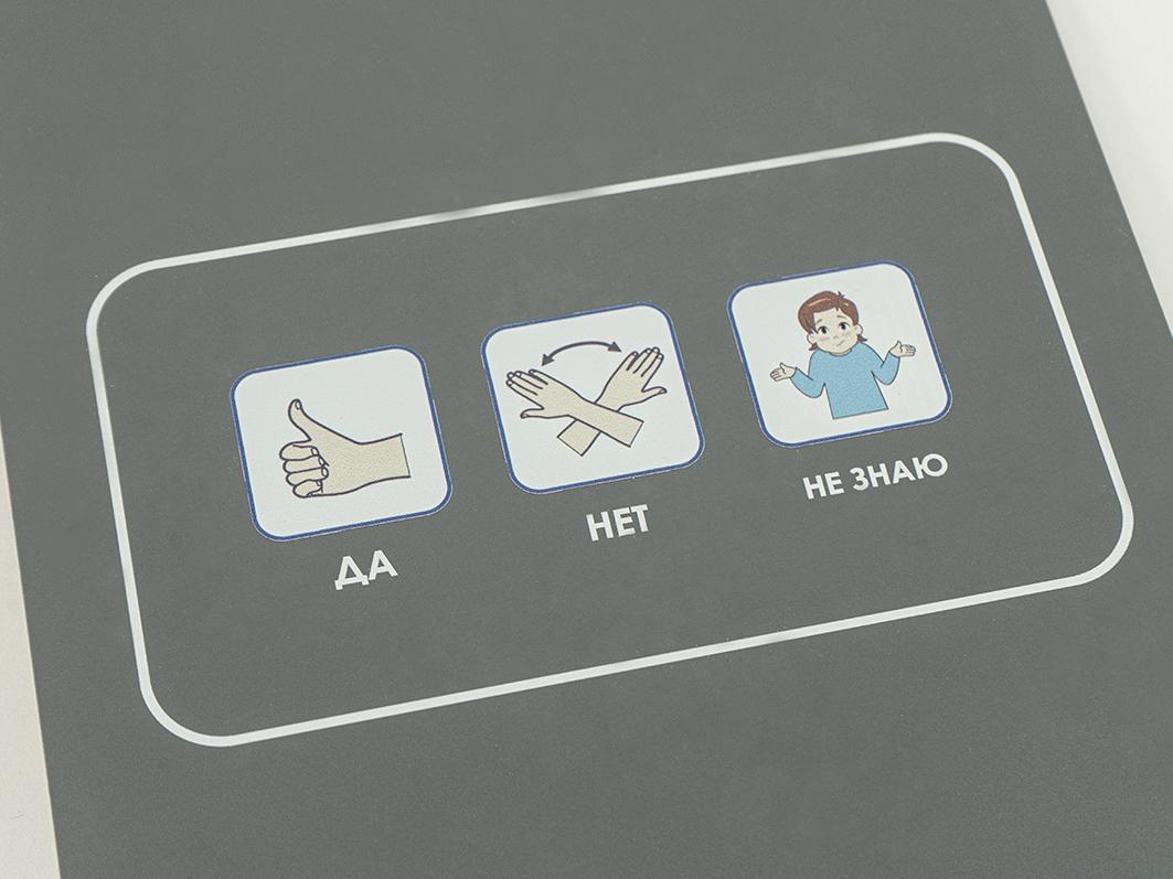 В комплекте есть тематические наклейки на страницы (для быстрого ориентирования) и наклейка-адресник. На задней стороне книги печать 3х символов: «да», «нет», «не знаю» - они позволяют ребёнку быстро сообщить собеседнику краткий ответ.