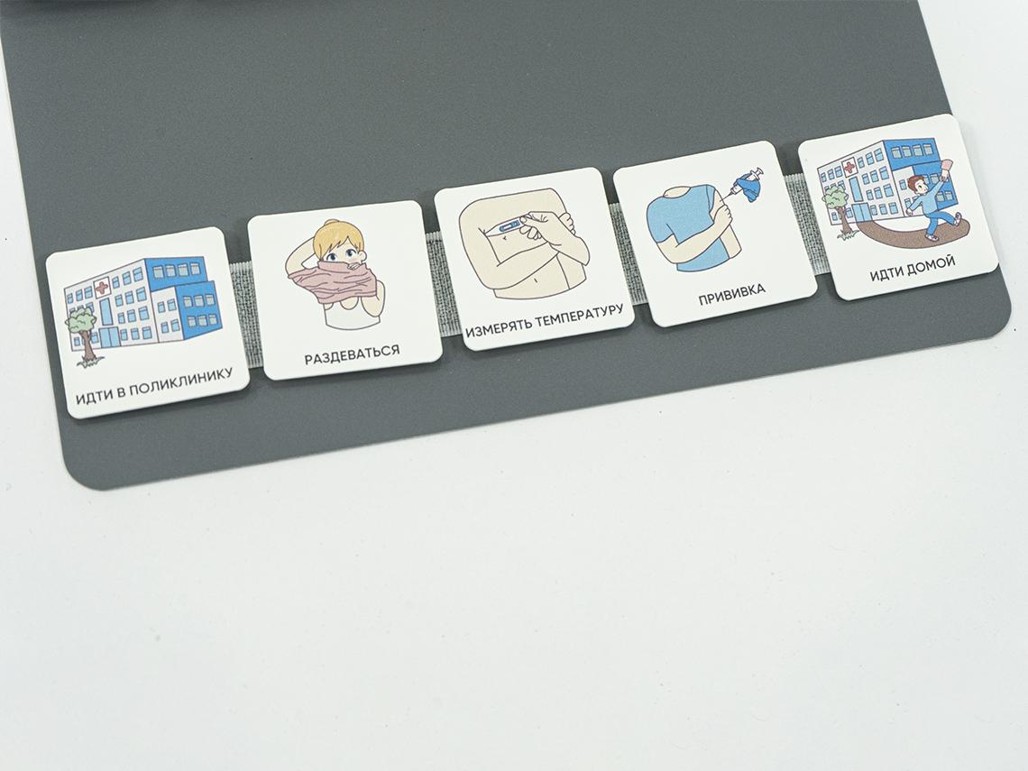 Тематические наборы, которые включены в базовый комплект: одеваюсь, игрушки, поликлиника, дом, ягоды и фрукты, еда, улица, действия, что нельзя делать, школа, состояние человека, детская площадка, части тела, питомцы, животные, поощрения.