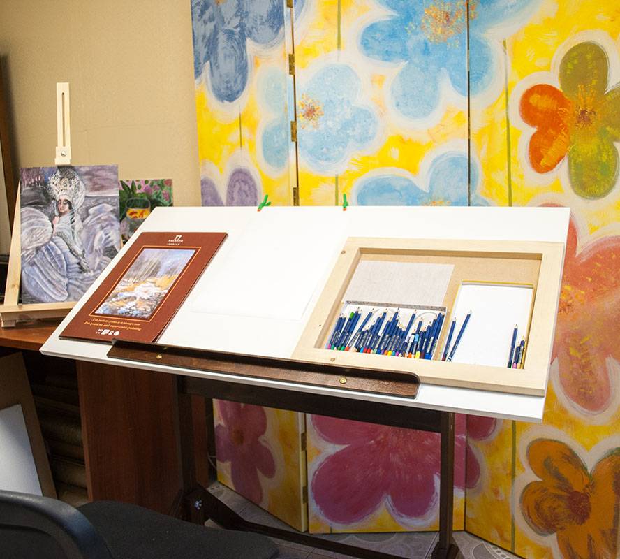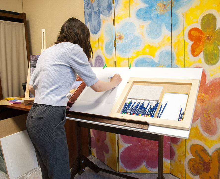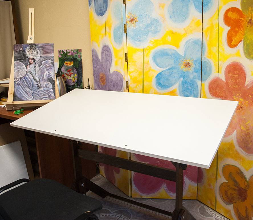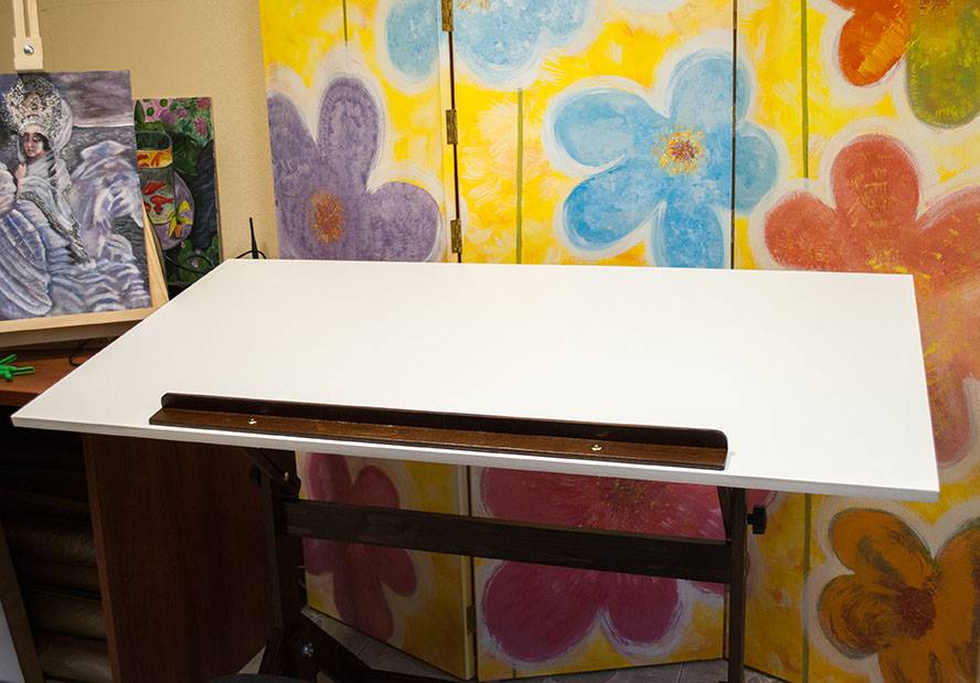 Наклонная поверхность художественного стола создает одну небольшую проблему: все скатывается. Для решения этой легкой трудности у Гильермо предусмотрен бортик. На него, как на полочку, можно складывать карандаши, ручки, маркеры, опирать альбом или планшет с бумагой. Благодаря ему стол можно даже как мольберт использовать.