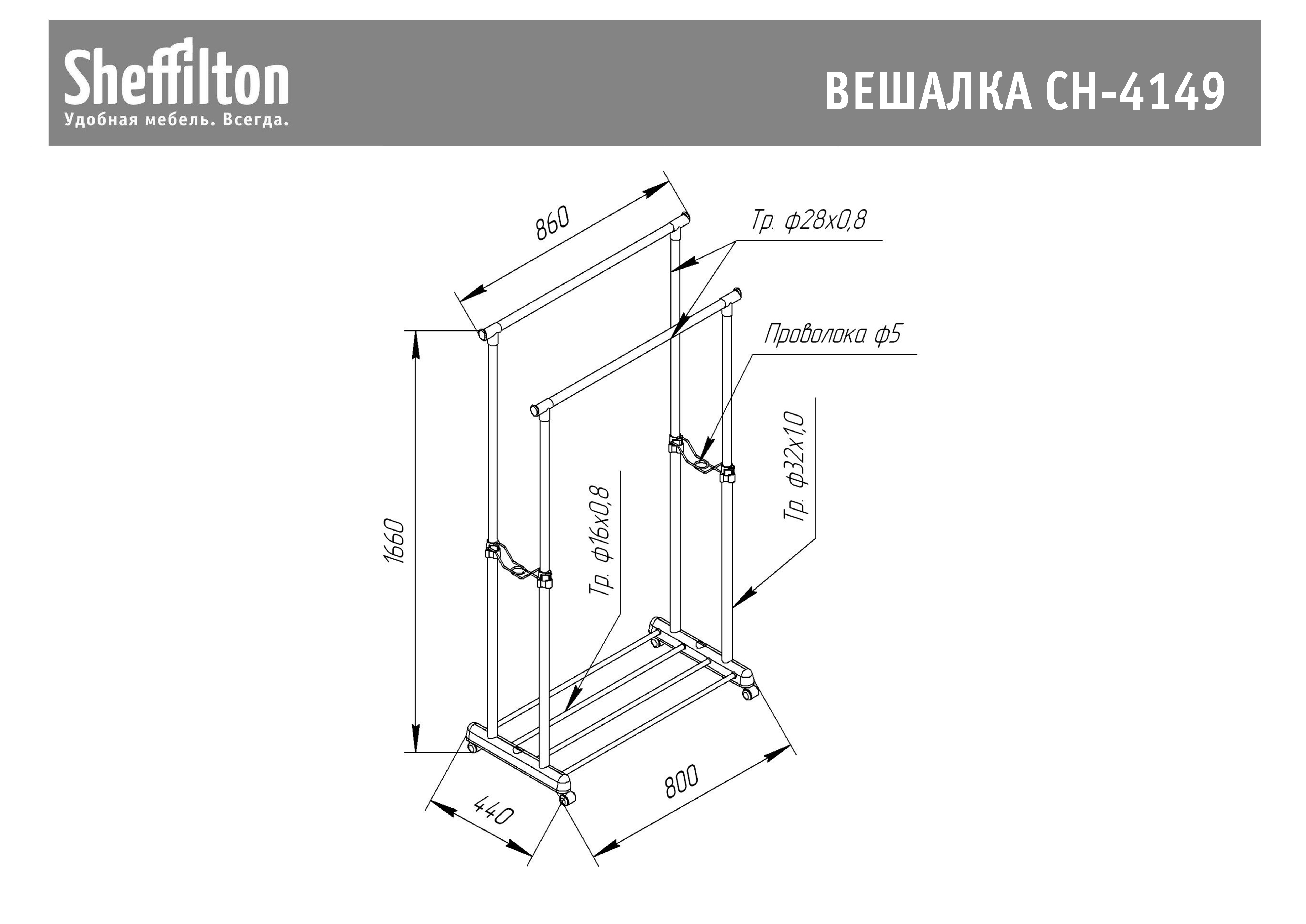 Штанги из хромированной трубы (диаметр/толщина: 28/0,8 мм); стойки - из металлической трубы, (диаметр/толщина: 32/0,8 мм, 28/0,8 мм) и полка 16/0,8 мм.