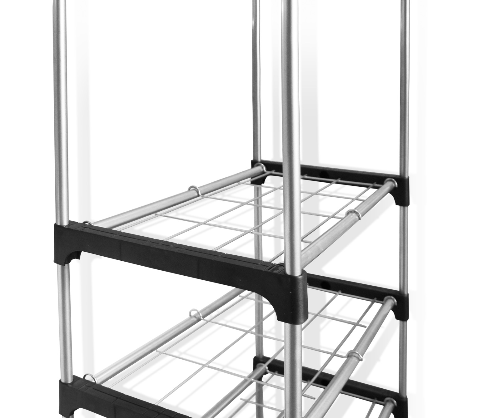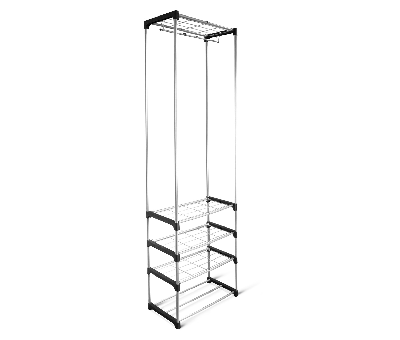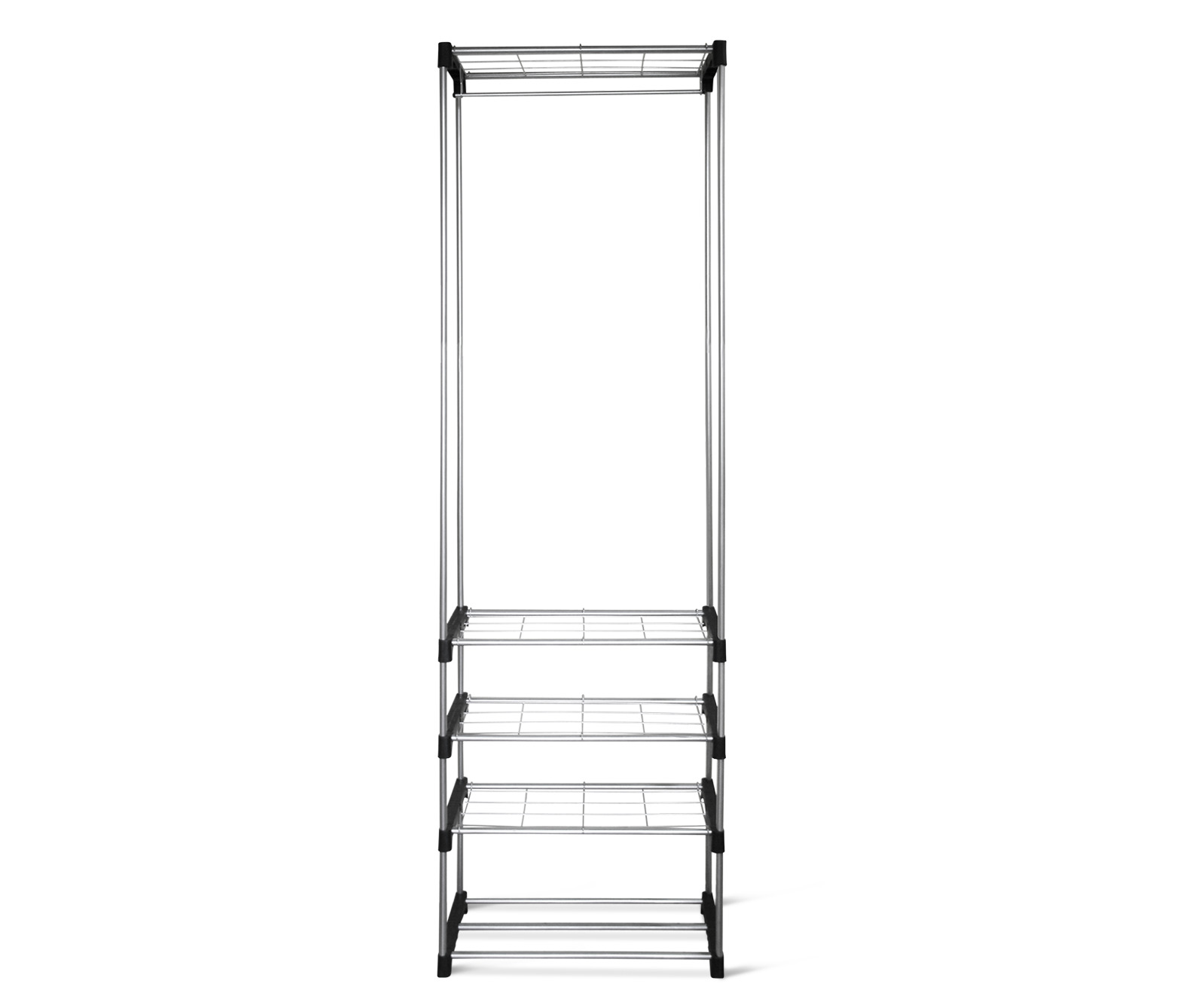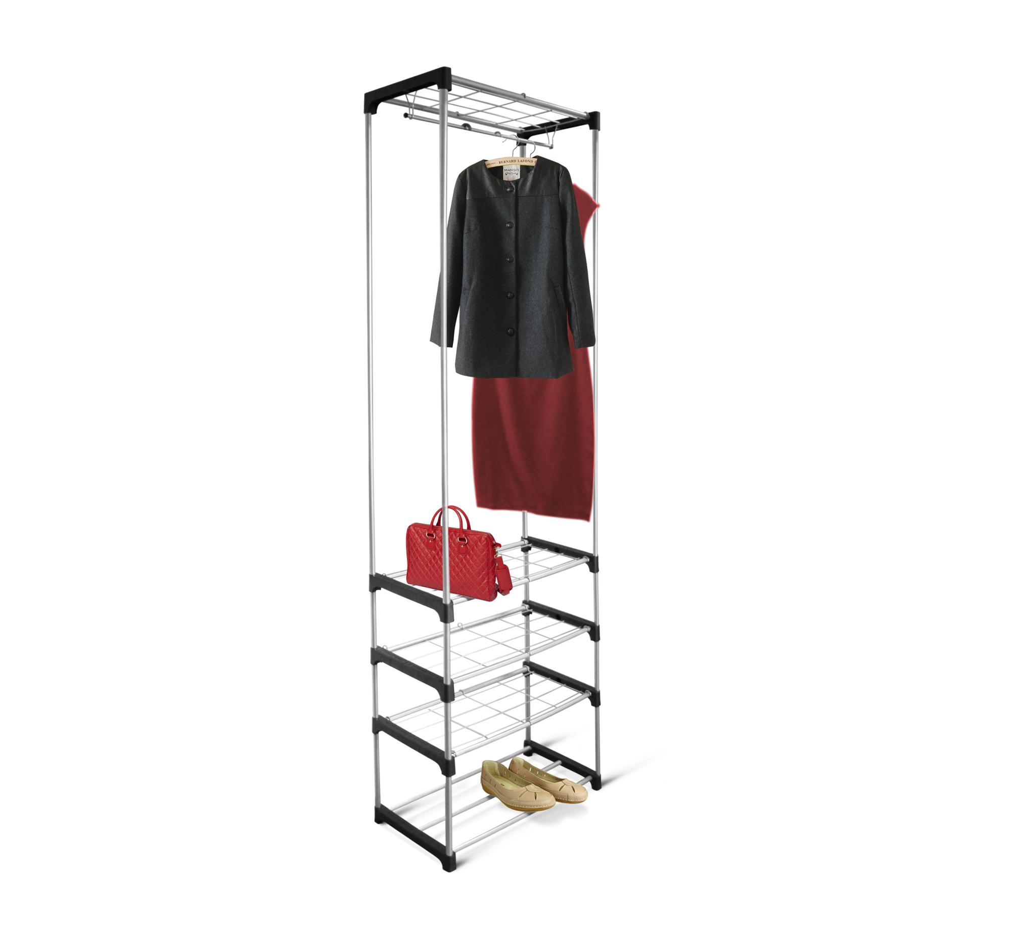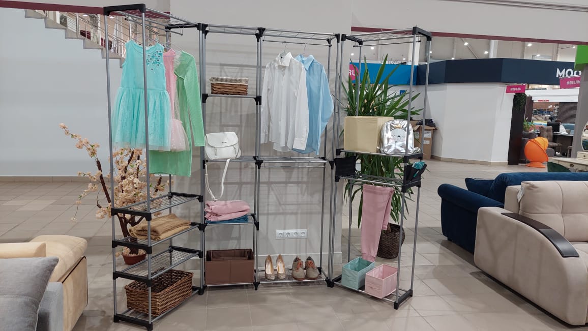 - Высокая вешалка с полками и штангой позволяет рационально использовать площадь пола.
