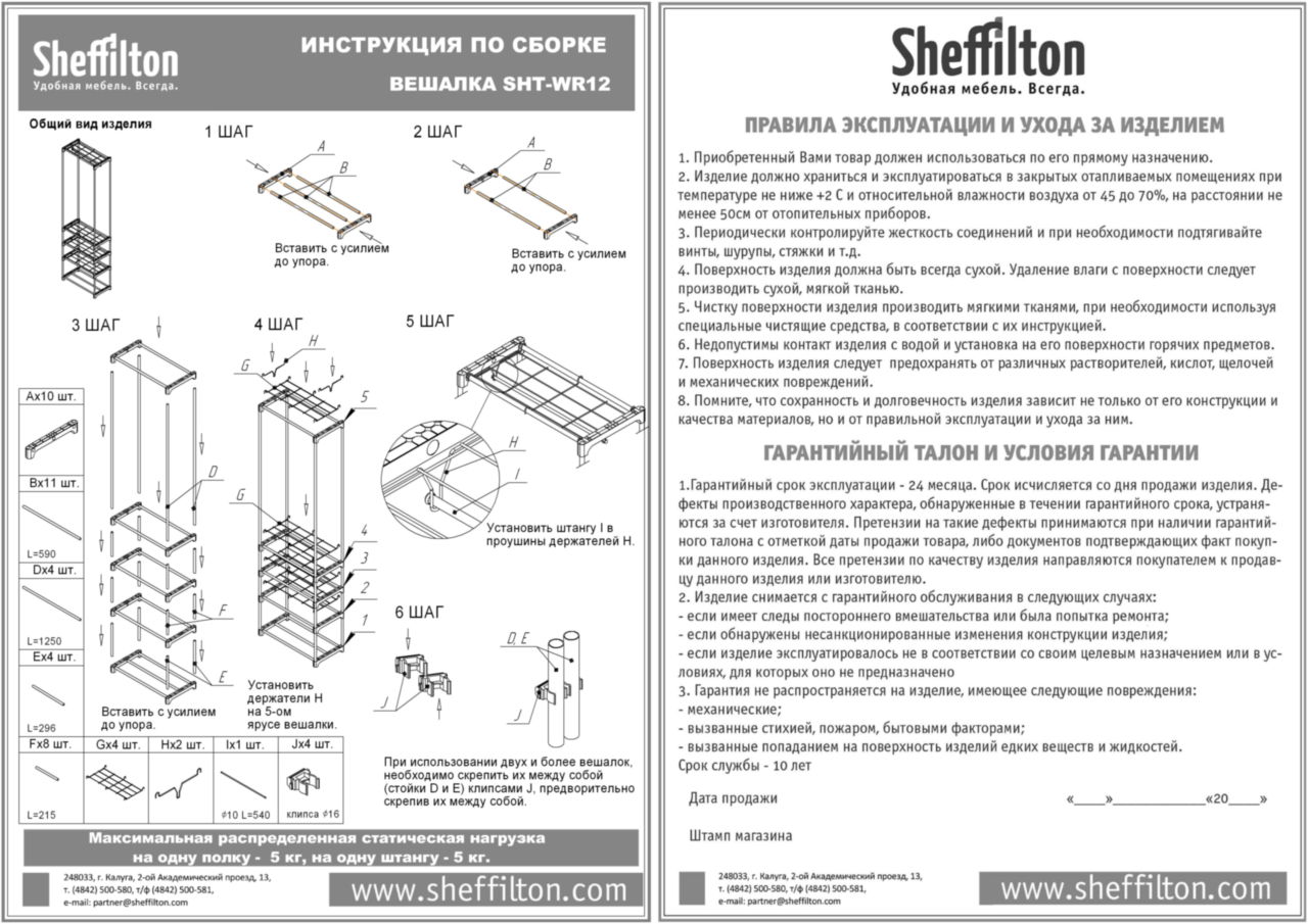 - Максимальная распределенная нагрузка на одну полку - 5 кг., на одну штангу - 5 кг.