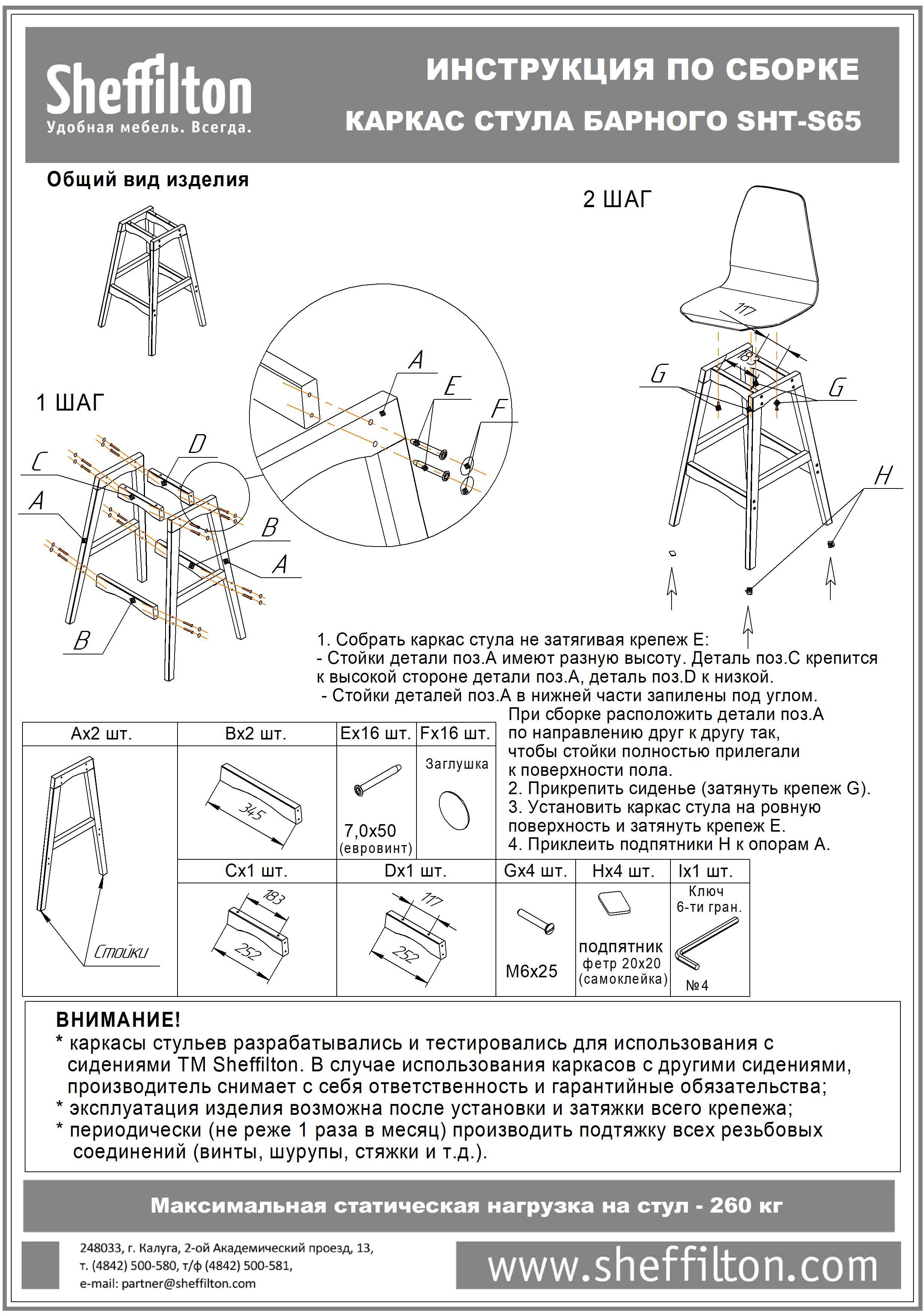- Внимание!!! Каркасы стульев разрабатывались и тестировались для использования с сидениями ТМ Sheffilton. В случае использования каркасов с другими сидениями, производитель снимает с себя ответственность и гарантийные обязательства.