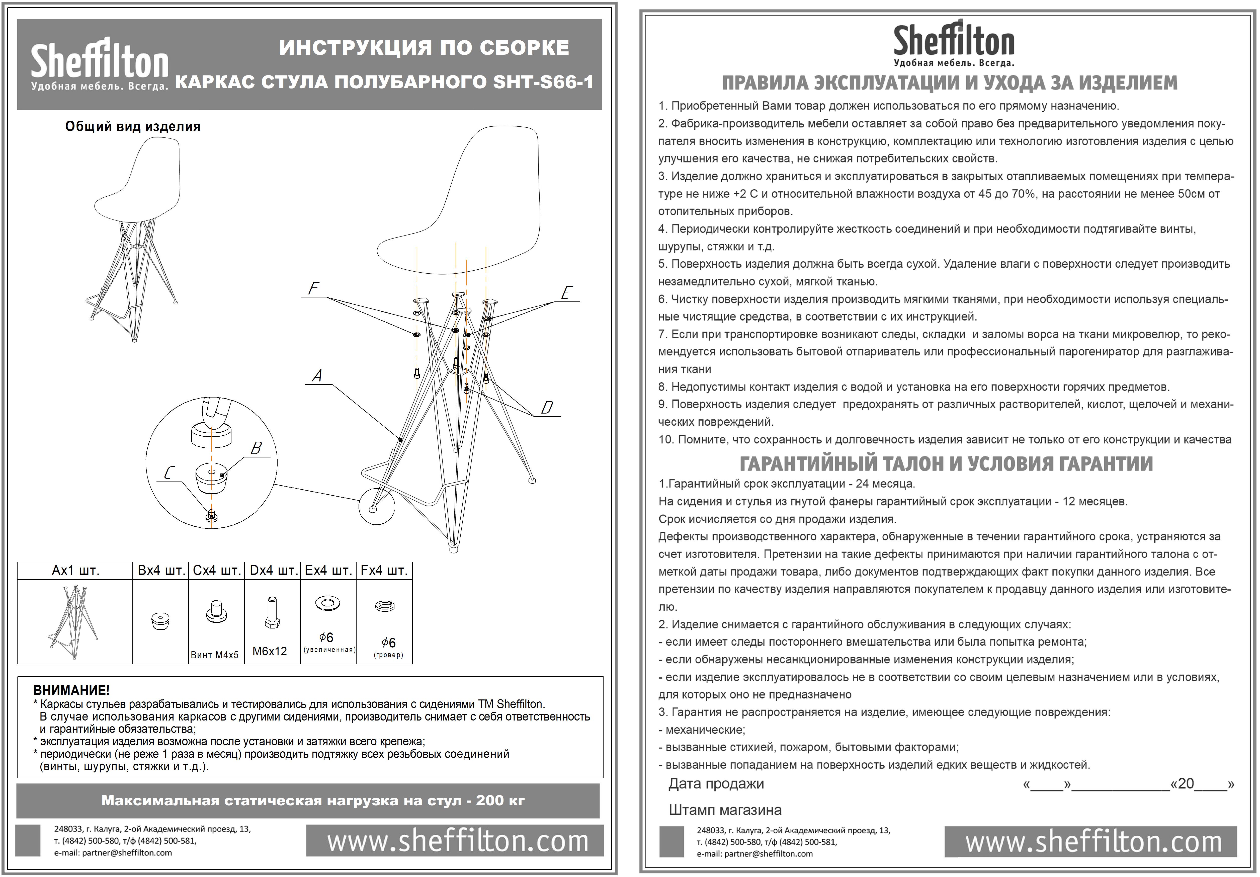 - Внимание!!! Каркасы стульев разрабатывались и тестировались для использования с сидениями ТМ Sheffilton. В случае использования каркасов с другими сидениями, производитель снимает с себя ответственность и гарантийные обязательства.