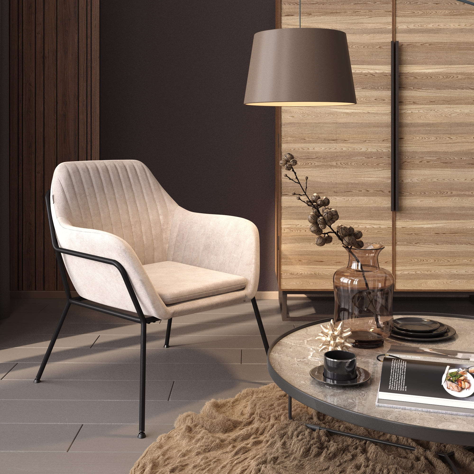 Дизайн модели основан на выдержанной цветовой гамме. Линии металлического каркаса, опоясывающие мягкое сидение, делают дизайн модели особенно стильной. Ножки плавно переходят в подлокотники и спинку, подчеркивая каждый изгиб кресла. Спинка, отклоненная под небольшим углом, и мягкая подушечка на сидении дают еще больший комфорт при использовании.