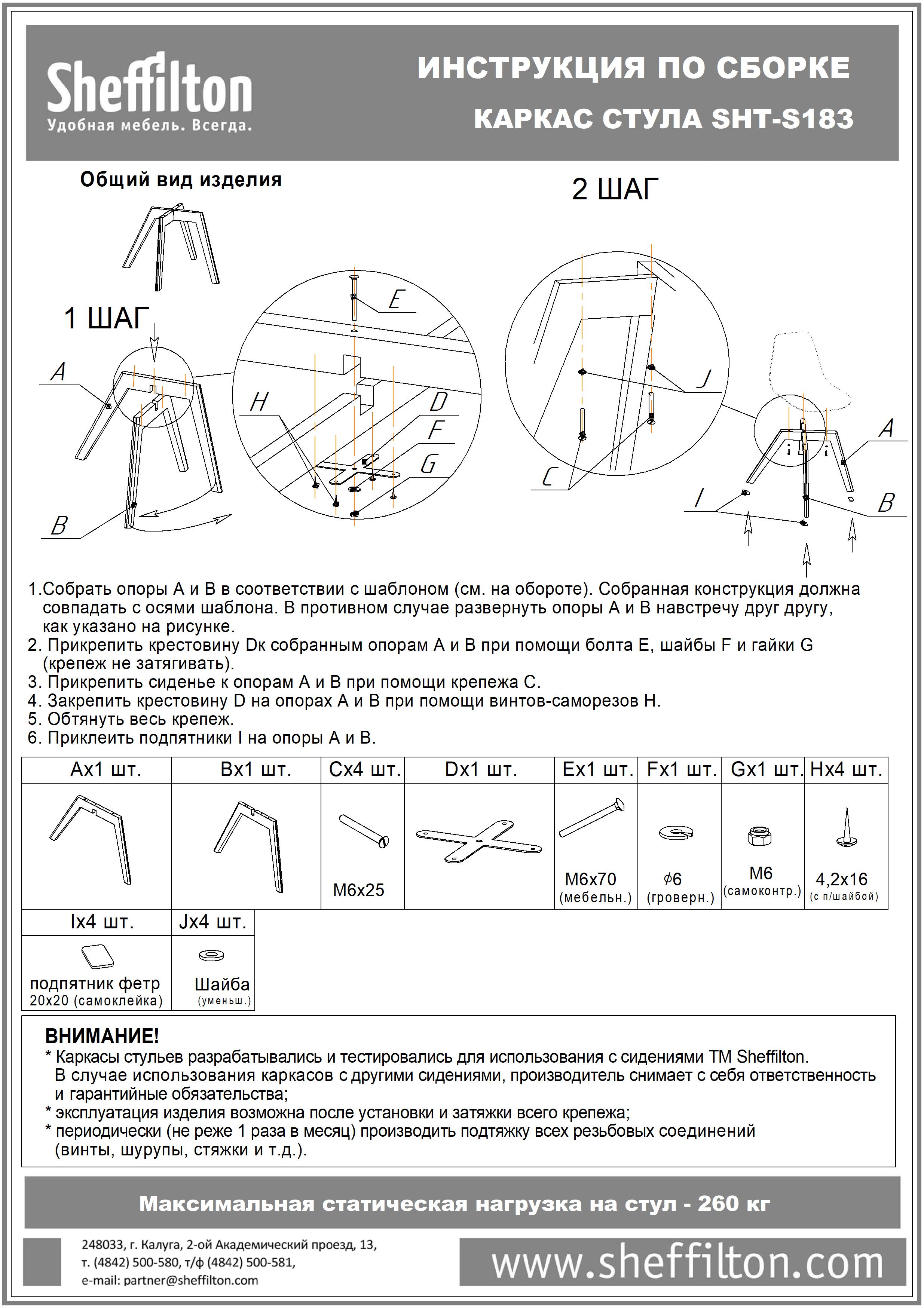 Внимание!!! Каркасы стульев разрабатывались и тестировались для использования с сидениями ТМ Sheffilton. В случае использования каркасов с другими сидениями, производитель снимает с себя ответственность и гарантийные обязательства.