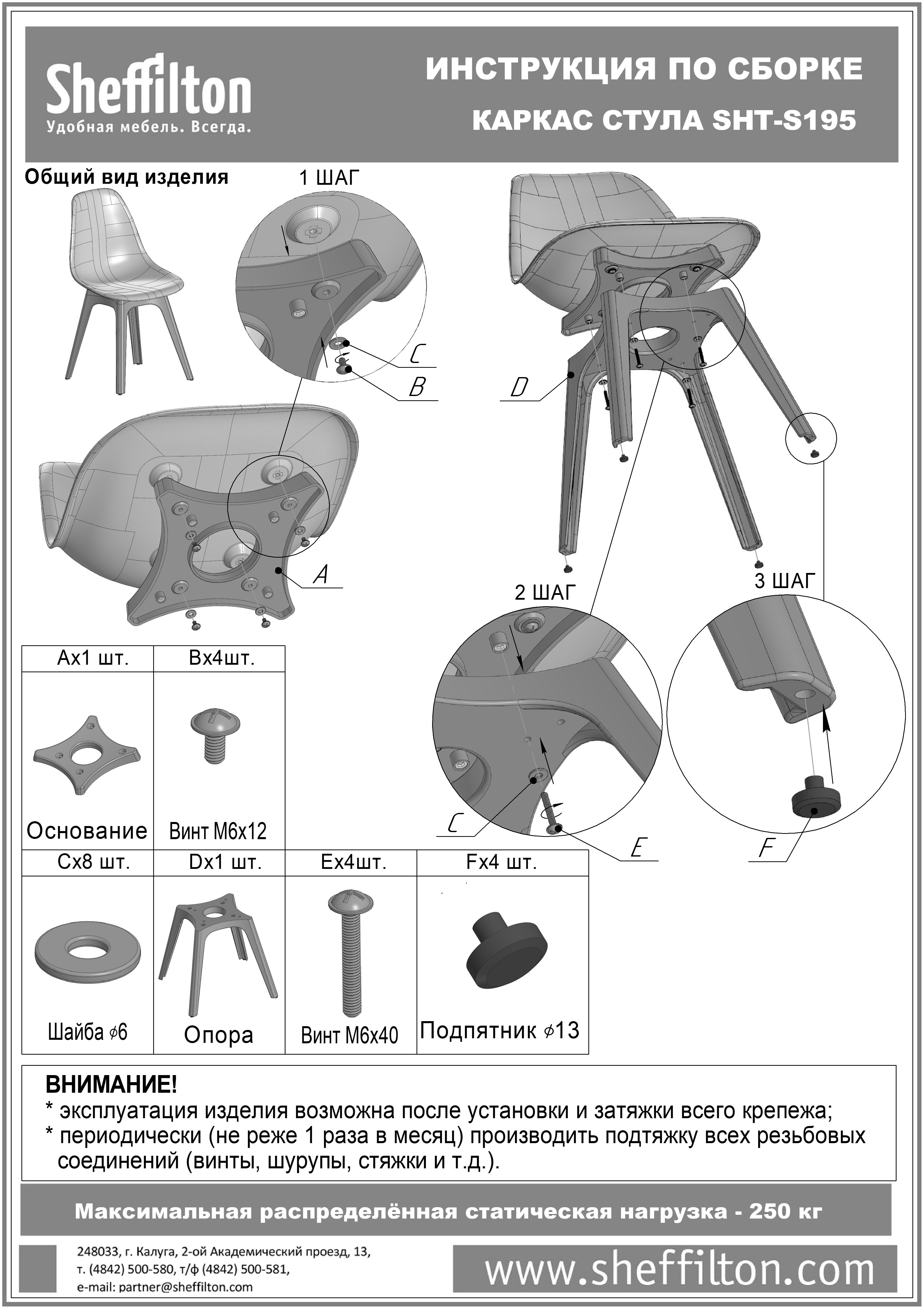 Внимание!!! Каркасы стульев разрабатывались и тестировались для использования с сидениями ТМ Sheffilton. В случае использования каркасов с другими сидениями производитель снимает с себя ответственность и гарантийные обязательства.