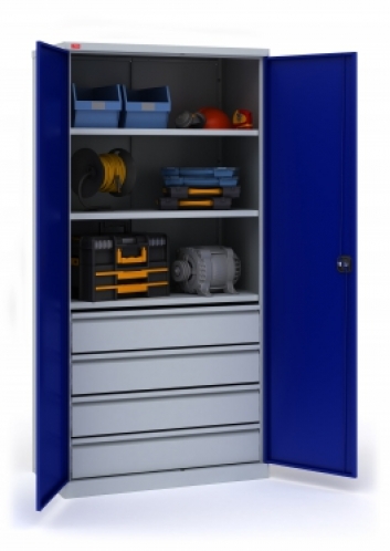 Инструментальный шкаф ИП-1/8 - вариант возможной комплектации (инструменты на фото в комплектацию не входят). К существующей комплектации можно добавить дополнительные элементы по желанию. Инструментальные шкафы оборудованы замком повышенной секретности и ригельной системой запирания. Полимерное порошковое покрытие корпус светло-серого цвета (RAL 7035) двери синие (RAL 5002).