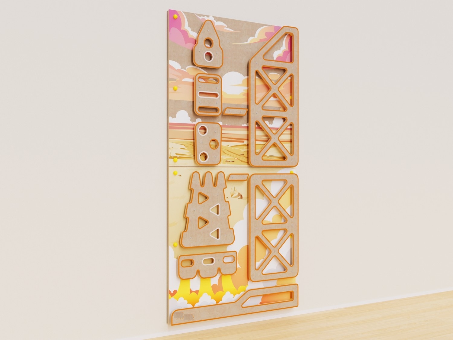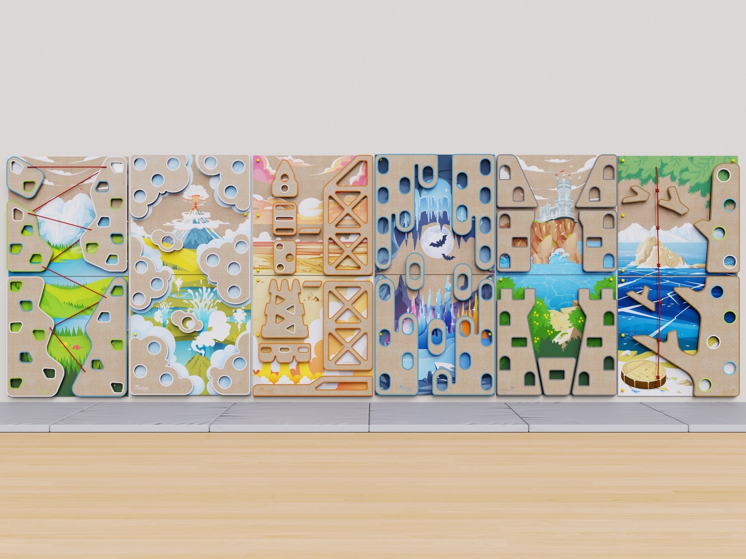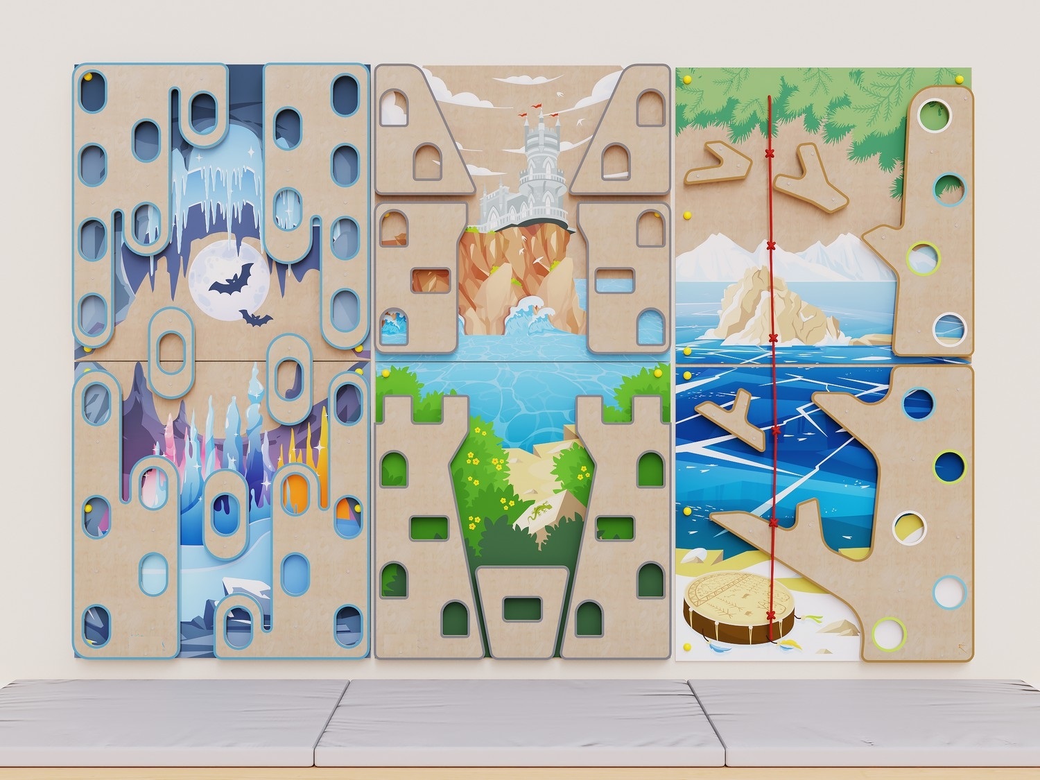Скалодром прочно крепится к стене шестью анкерами. После установки анкеры для безопасности и красоты закрываются заглушками. Для комфортной игры комплекс можно дополнить матами.
