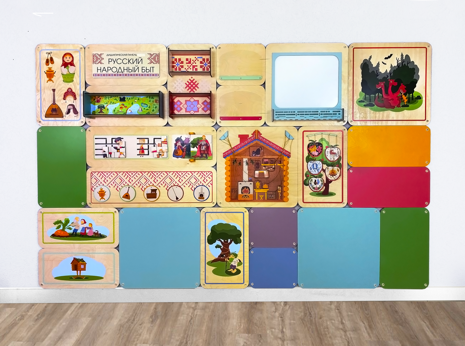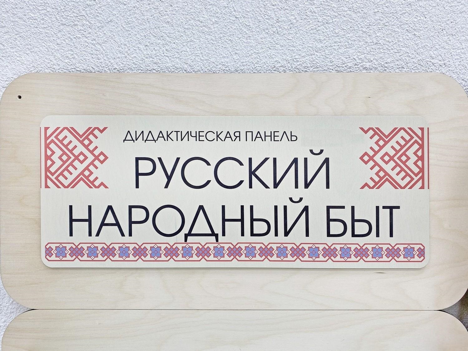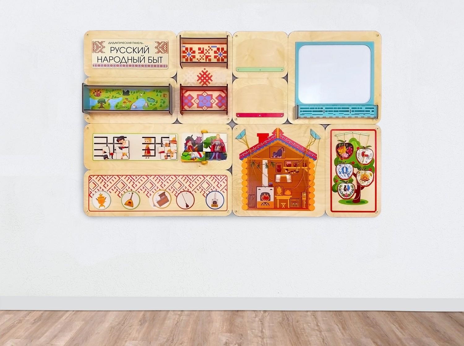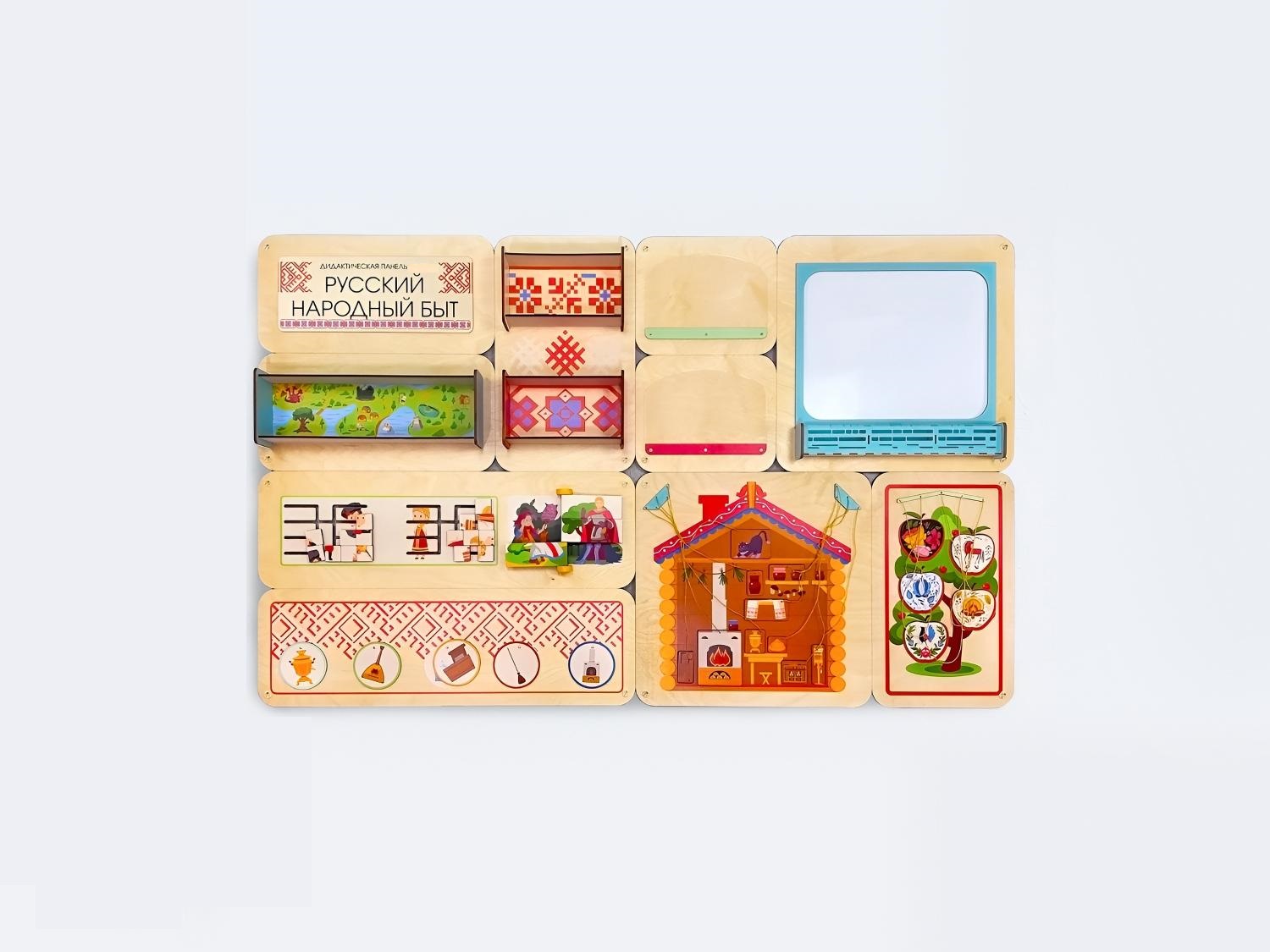 Дидактическая панель «Русский народный быт» знакомит детей с элементами русской народной культуры, развивает логику и мышление, тренирует мелкую моторику и цветовосприятие.