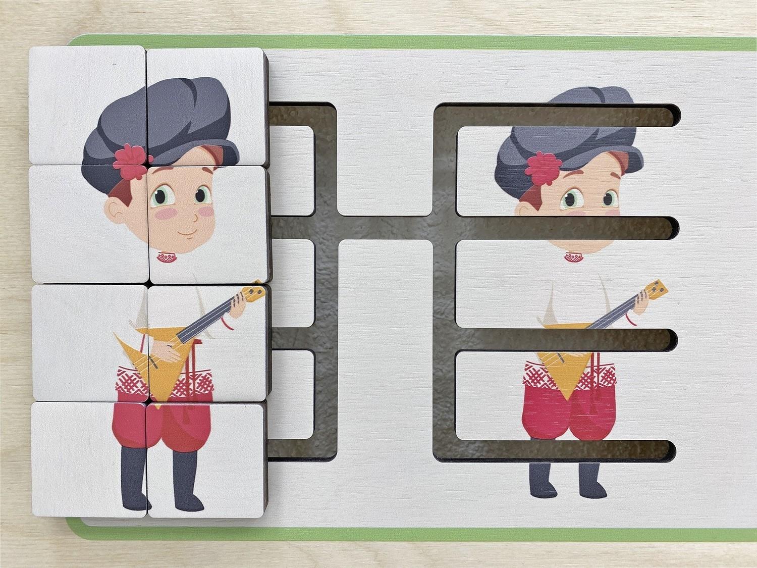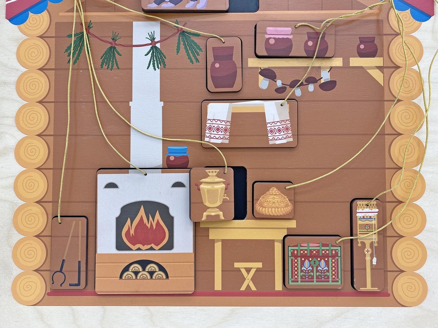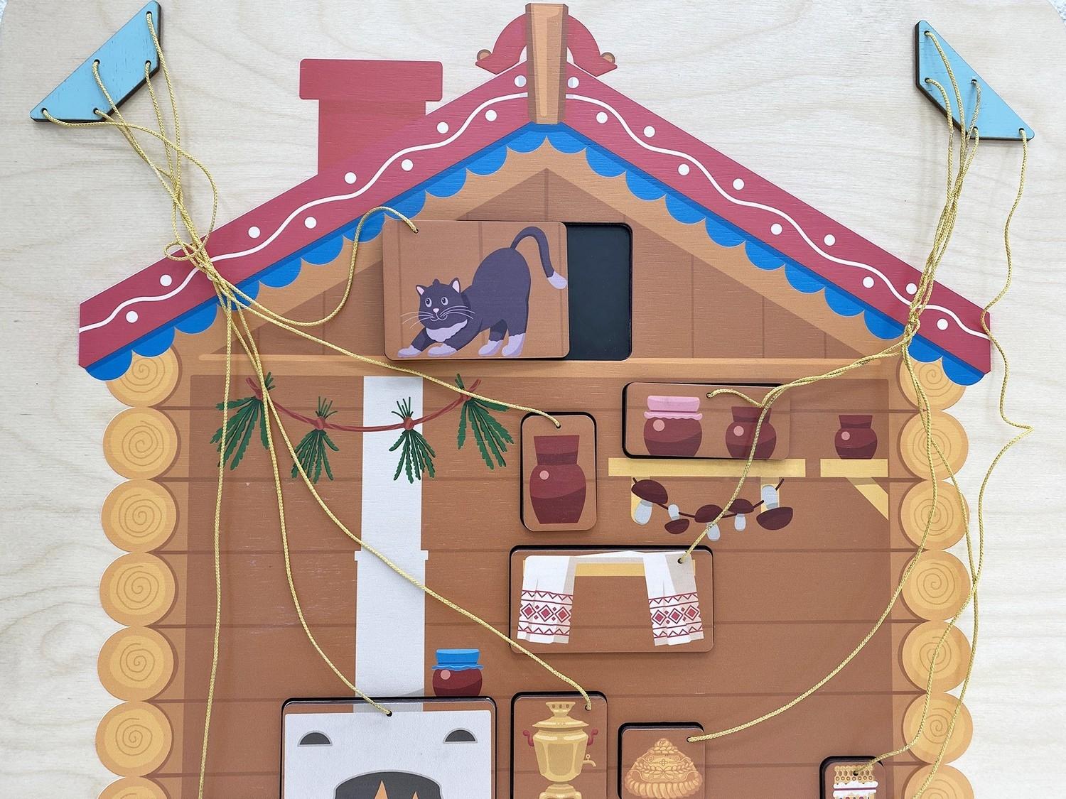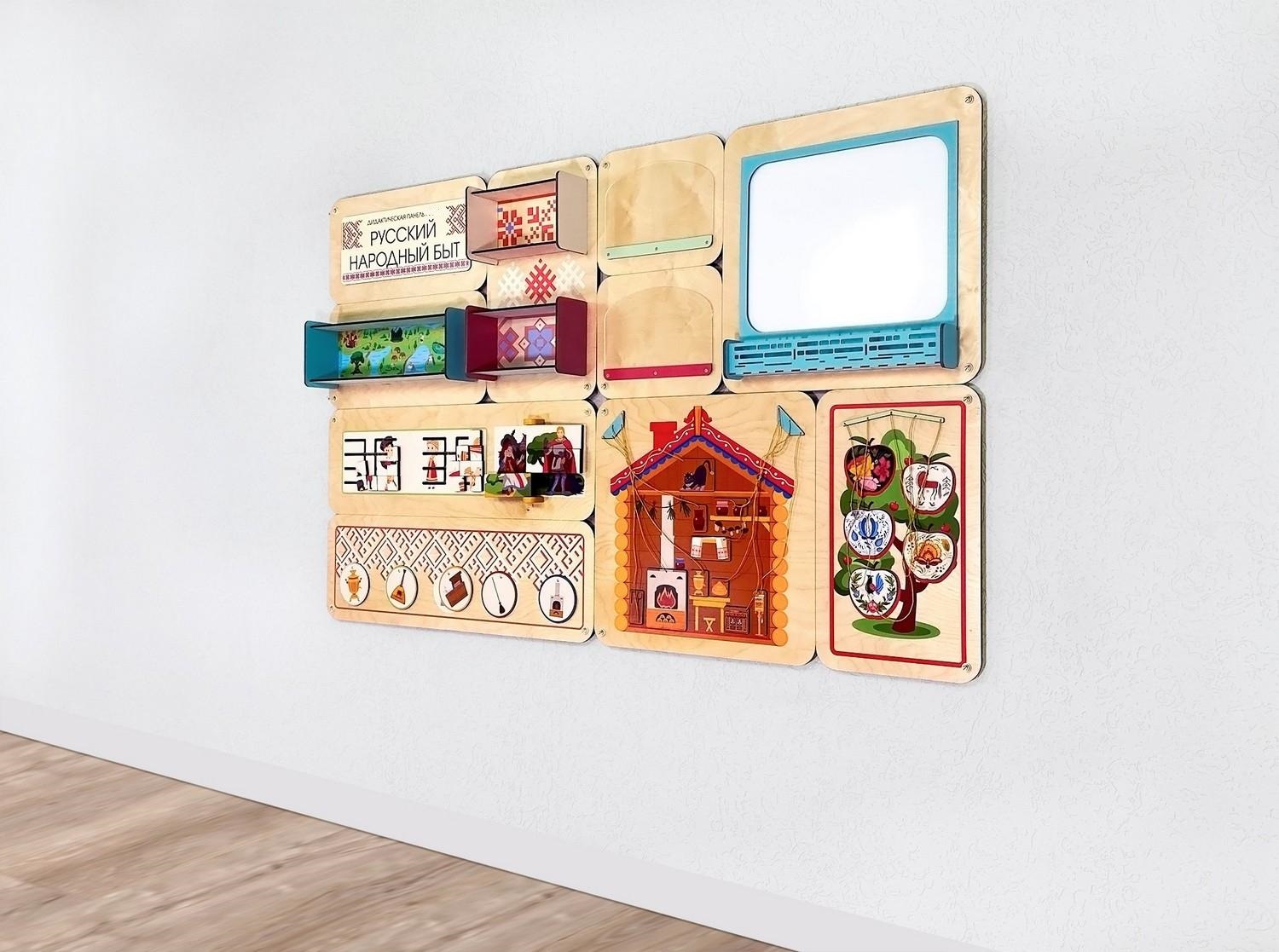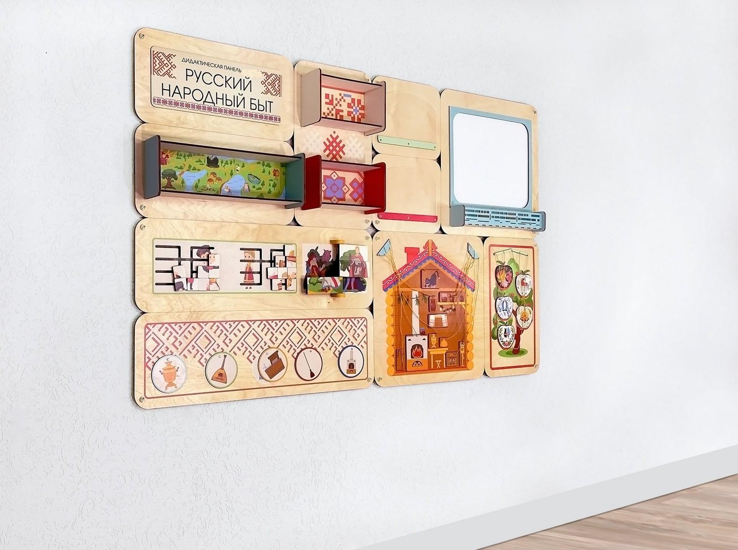 Дидактическая панель «Русский народный быт» знакомит детей с элементами русской народной культуры, развивает логику и мышление, тренирует мелкую моторику и цветовосприятие.
