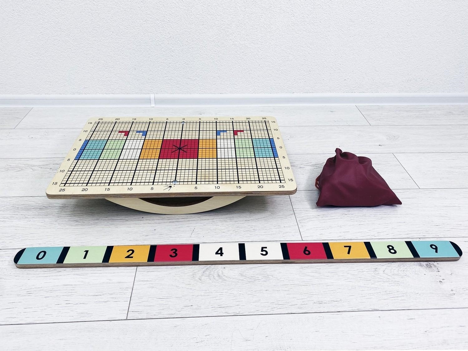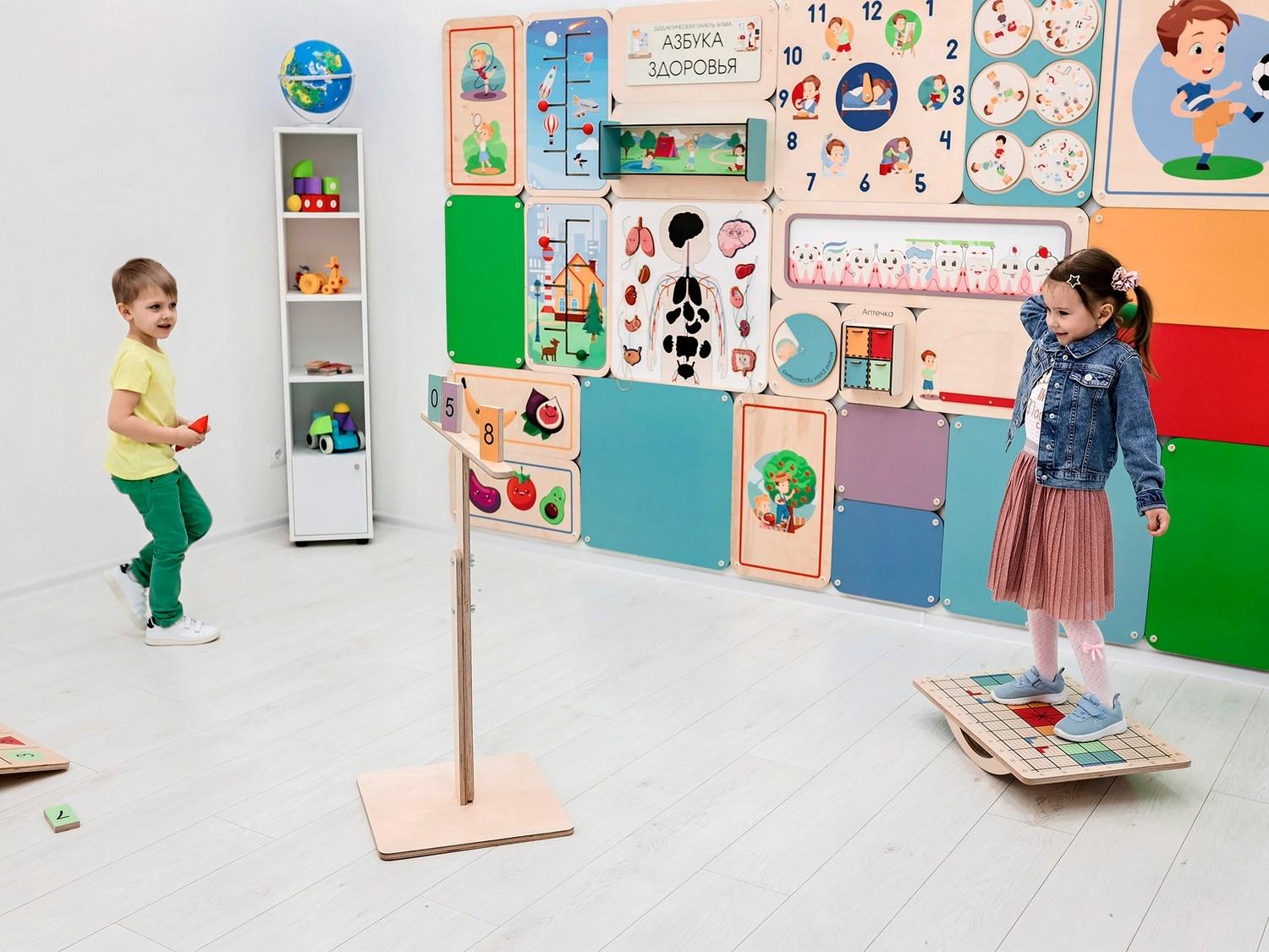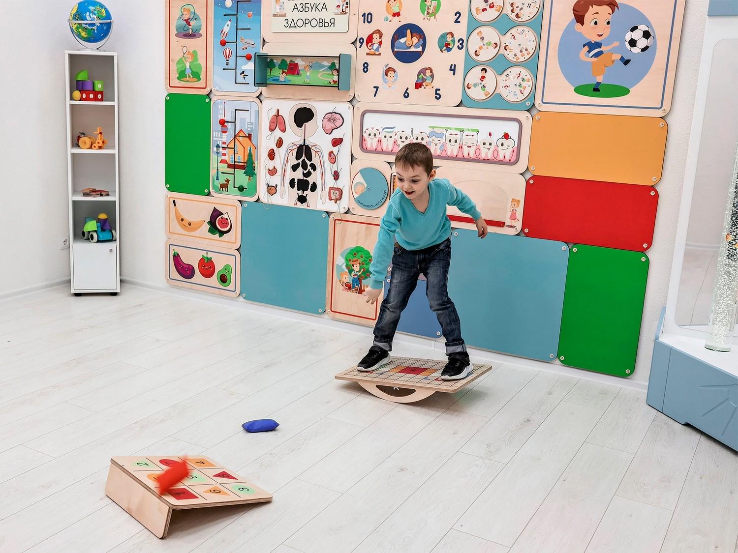 Балансир изготовлен из прочной экологичной фанеры, не имеет острых углов, о которые можно травмироваться. Изделие хорошо отшлифовано и покрыто огнезащитным лаком, стойким к загрязнениям и истиранию. В комплекте идёт набор дополнительного инвентаря для занятий, методическое пособие и универсальный ключ для поворота полозьев.