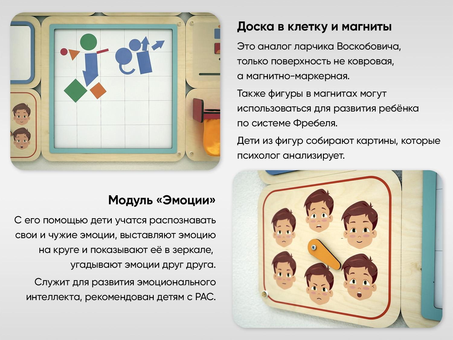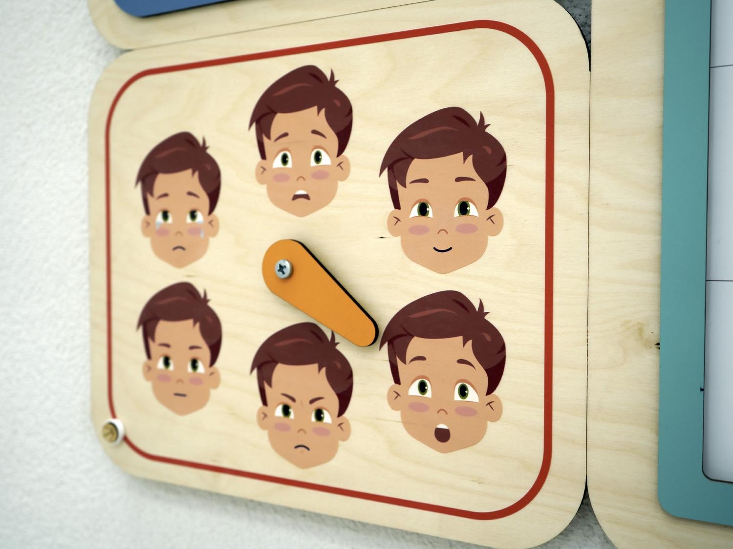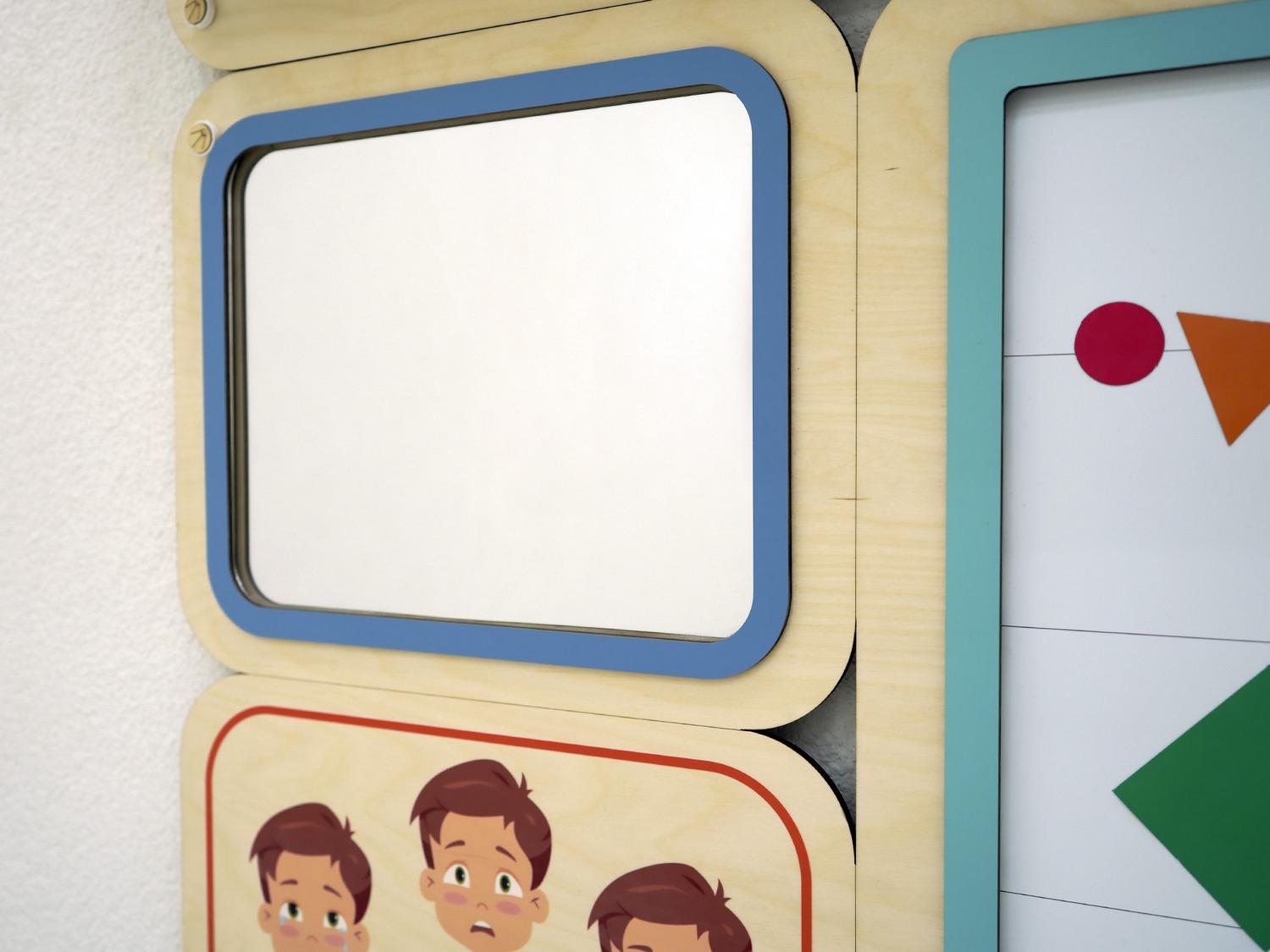 - Модуль «Эмоции» со стрелкой и акриловое безопасное зеркало. С его помощью дети учатся распознавать свои и чужие эмоции, выставляют эмоцию на круге и показывают её в зеркале, угадывают эмоции друг друга. Служит для развития эмоционального интеллекта, рекомендован детям с РАС.