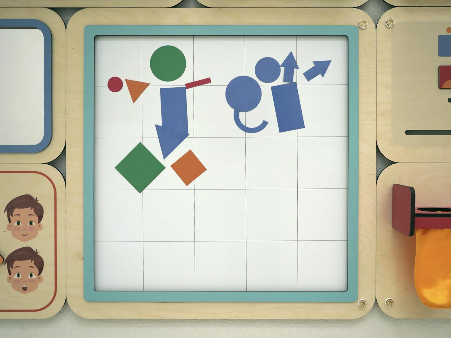 - Доска в клетку и магниты, хранящиеся в ящичках. Это аналог ларчика Воскобовича, только поверхность не ковровая, а магнитно-маркерная. Также фигуры в магнитах могут использоваться для развития ребёнка по системе Фребеля. Дети из фигур собирают картины, которые психолог анализирует.