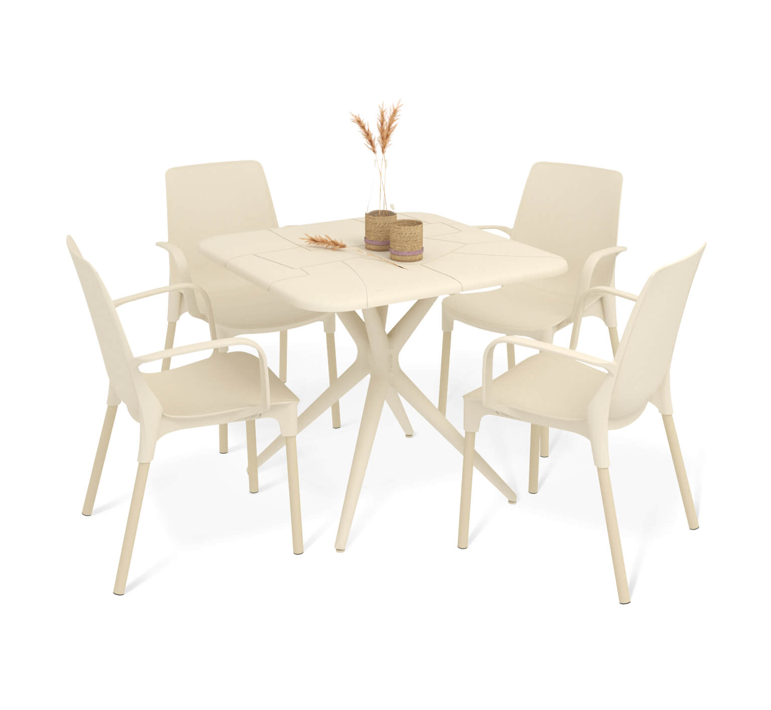 Благодаря повышенным АТМОСФЕРОСТОЙКИМ СВОЙСТВАМ, столешница, подстолье сиденье хорошо переносят воздействие погодных условий. Не деформируются и имеют более устойчивое сопротивление к изменению цвета.
