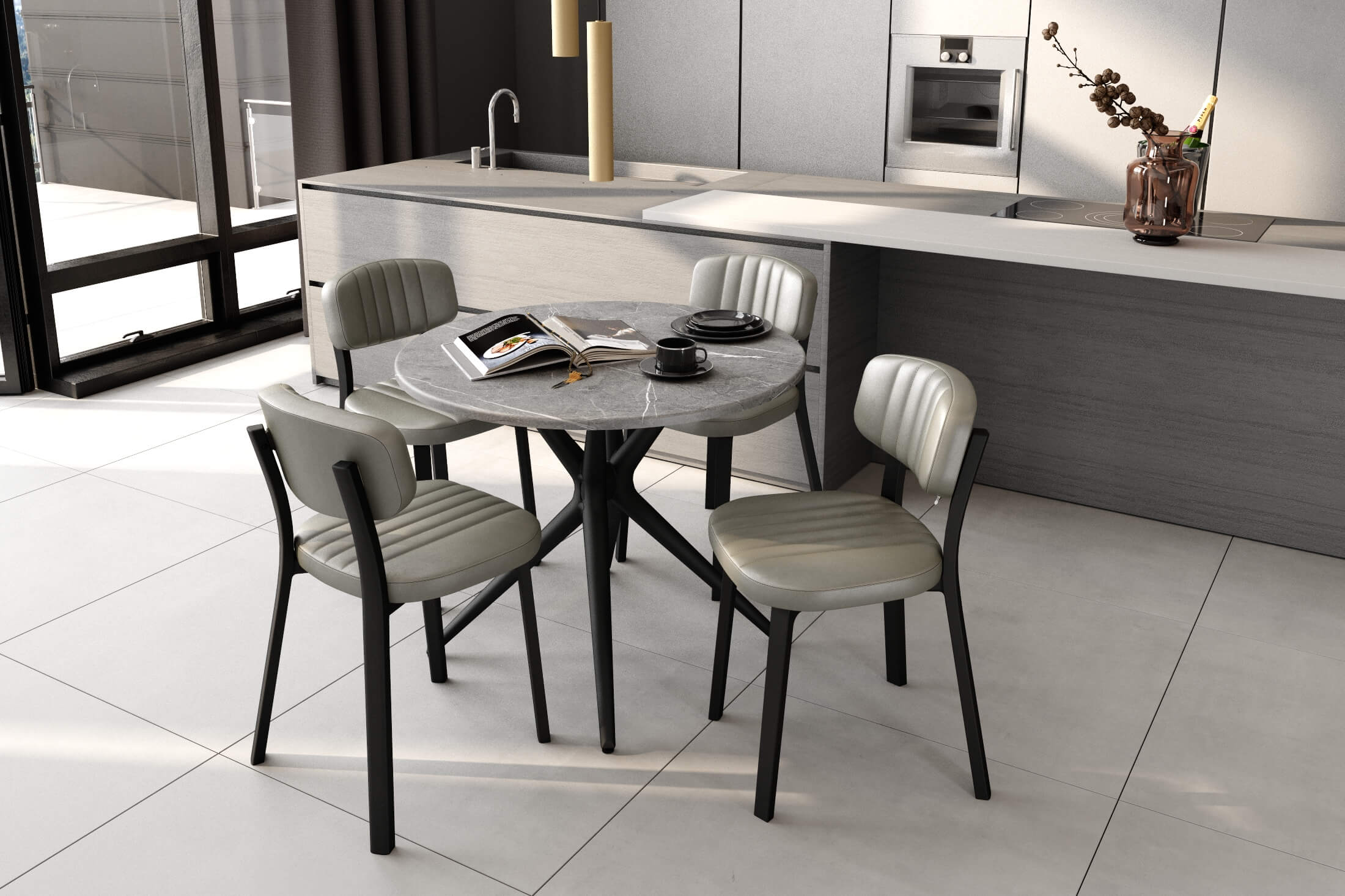 Стол с красивой столешницей из МДФ под натуральный мрамор и стулья с сидениями из кож.зама на пластиковом каркасе будет гармонично и со вкусом смотреться в доме, офисе, дизайн-студии, кафе, баре, ресторане.