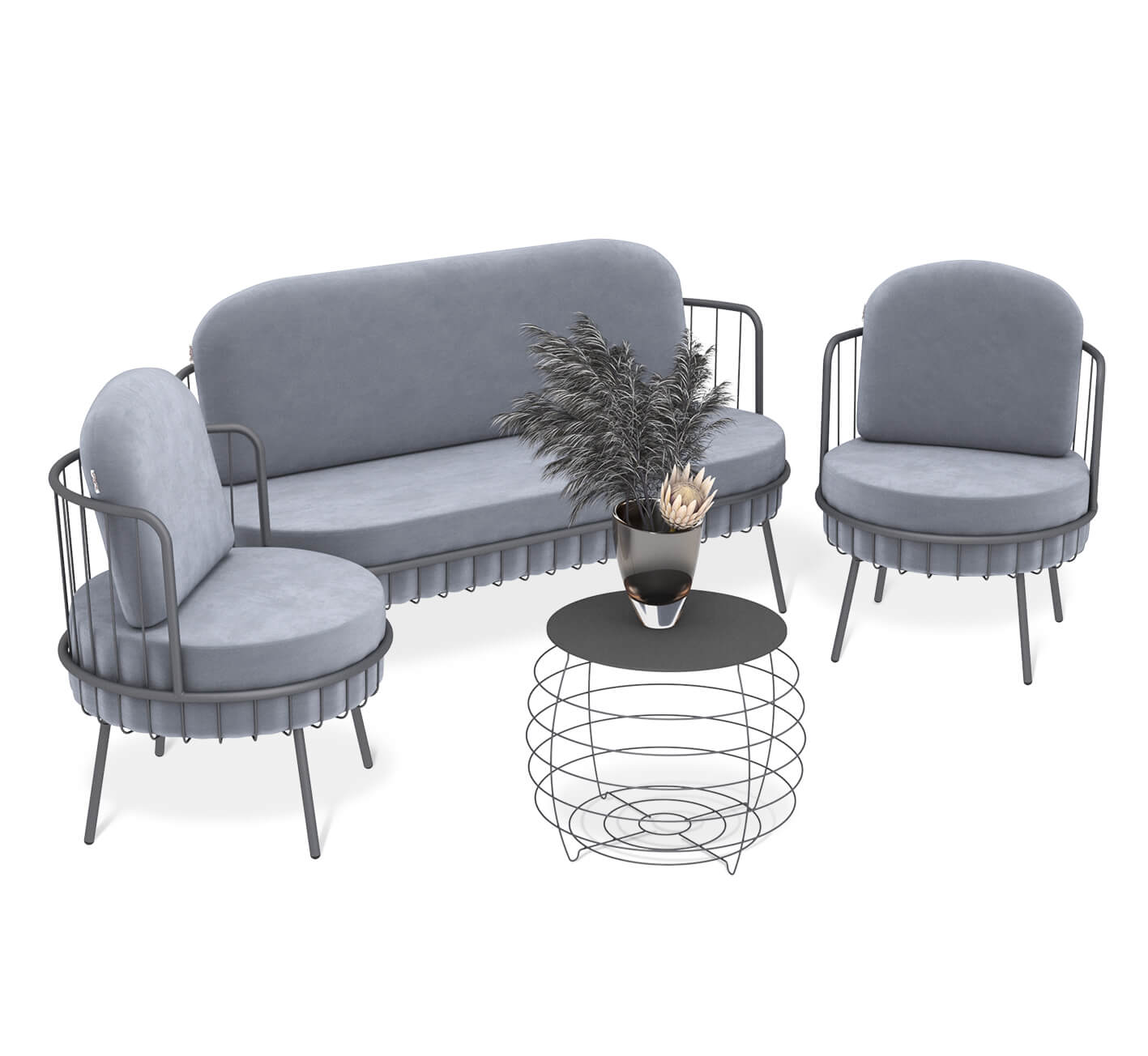 Каркас кресла и дивана выполнены из металла и окрашены порошковой краской, устойчивой к механическому воздействию. Наполнитель – высокоэластичный ППУ, не теряющий своих упругих свойств на протяжении долгих лет. Обивка из микровелюра отличается практичностью и простотой эксплуатации.
